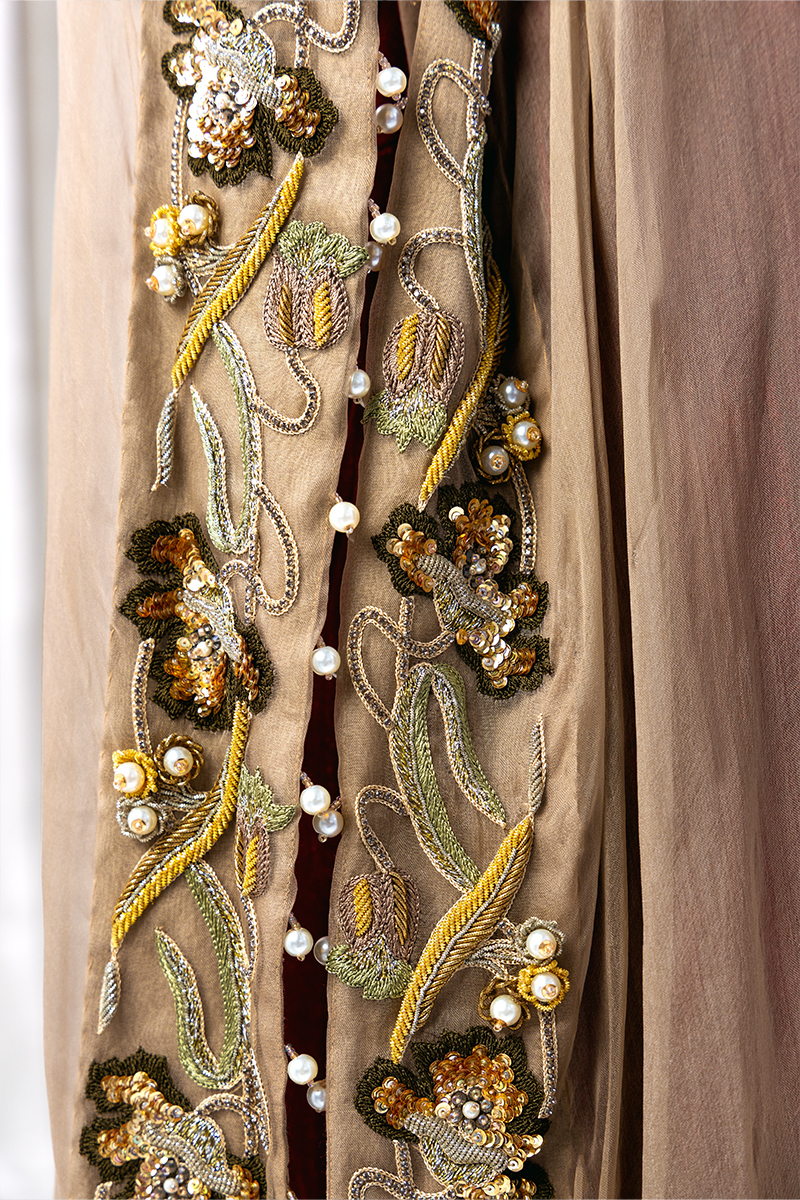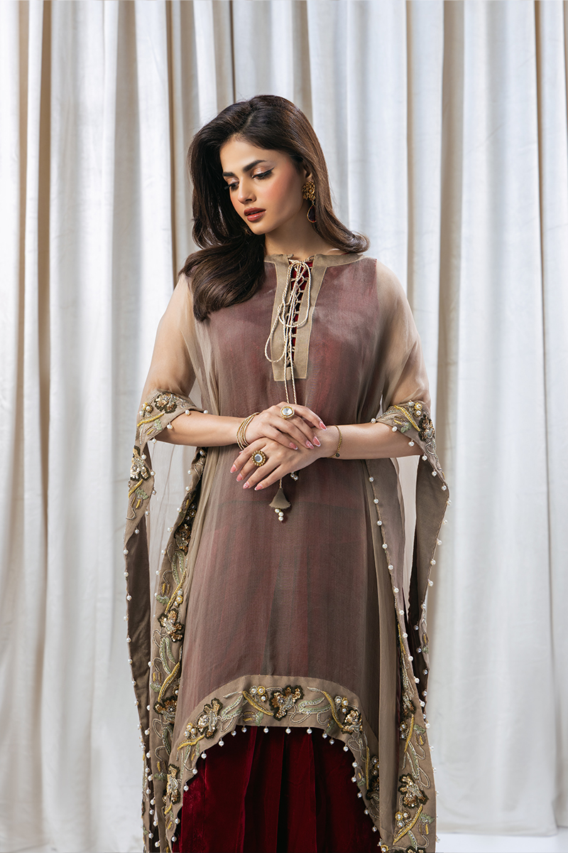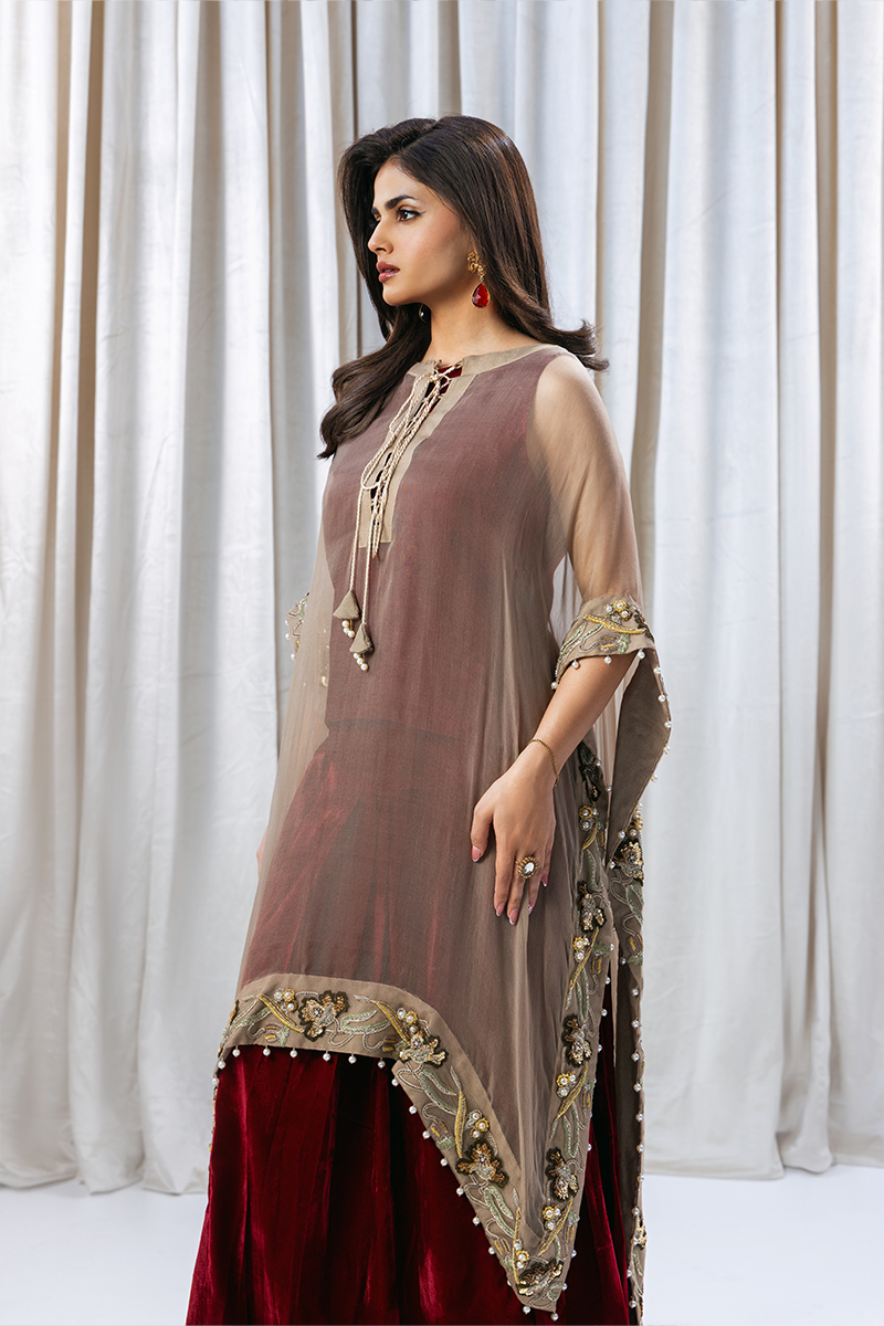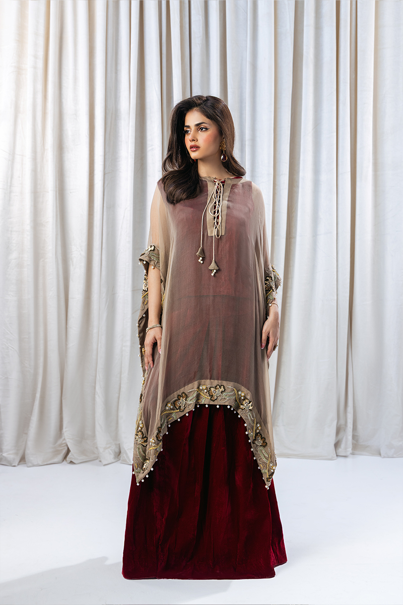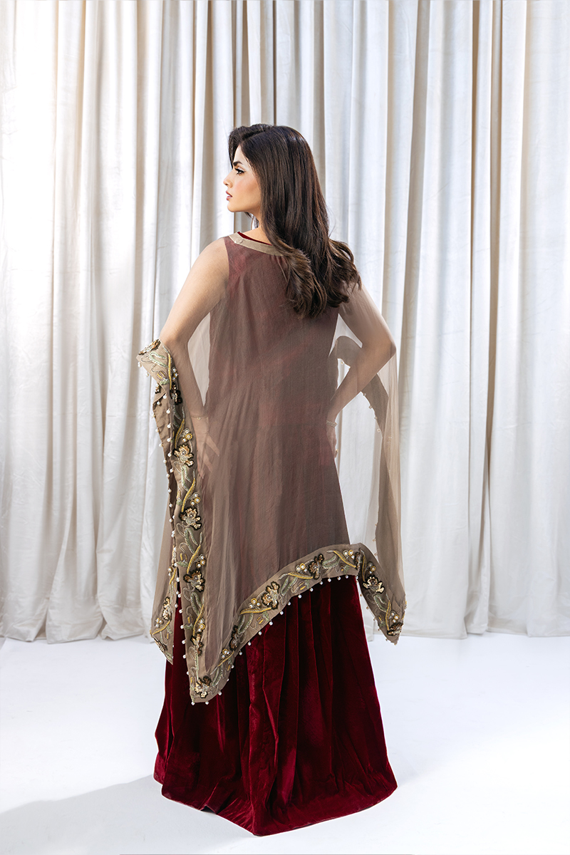 Elevate your elegance with this stunning ensemble featuring a deep red velvet blouse and skirt, paired with a luxurious pure organza pashmina poncho. The poncho boasts intricate Resham, Dabka, sequins, and pearl handwork, adding a touch of opulence to this regal outfit. Perfect for weddings and special occasions.”